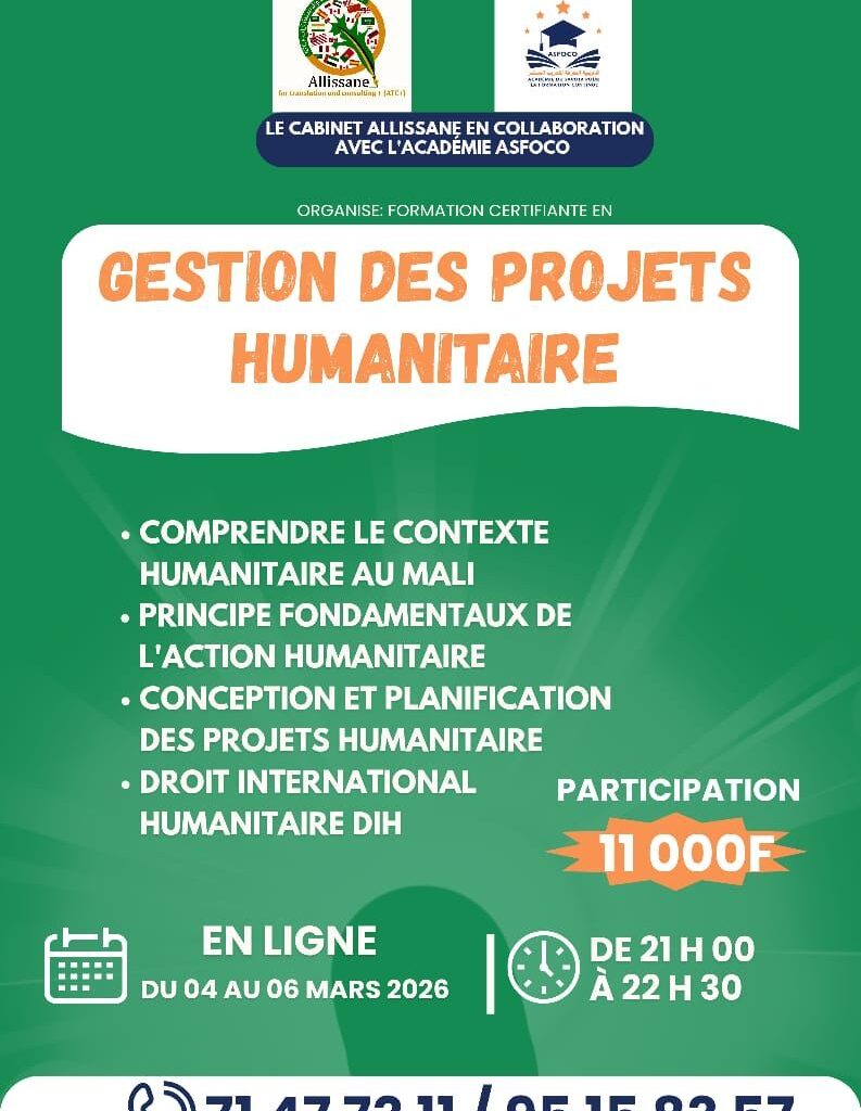 Allissane, en collaboration avec l’Académie du Savoir pour la Formation Continue, organise une formation en Gestion des projets humanitaires.